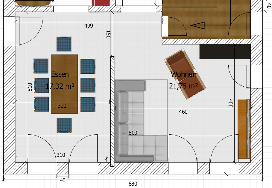 Zur Einrichtung des Wohnzimmers: Es gibt hier einige Prämissen. Ich selbst bin nicht sehr am Fernsehen interessiert, sondern am Ausblick. Daher ist für mich obligatorisch, dass zumindest der Relaxsessel Richtung Süden zeigt. Weiterhin mag ich es nicht mit dem Rücken zum Fenster oder Durchgang zu sitzen. Ist halt so eine persönliche Marotte. Damit limitiert sich jedoch die Couch / Fernseher Ausrichtung auf W-O oder O-W. Weiterhin ist der Blick Richtung Südwesten durch die Gabione verbaut. Das macht die Wohnzimmerplanung recht verzwickt. Der beengte Raum des EG tut dann sein Übriges. Die Wand im WZ ist, wie geschrieben, nicht obligatorisch, sofern es mit der Statik klappt. Meine erste Idee war es, eine verschiebbare Wand mit 120cm Höhe und jeweils ein Sideboard auf beiden Seiten zu bauen. Das kann ich dann mit einem Bodentank anbinden und je nach Platzbedarf ins Wohnzimmer oder ins Esszimmer schieben. Sowas wie auf dem Bild "Raumteiler" nur schiebbar und halb hoch. Findet aber meine Holde blöd