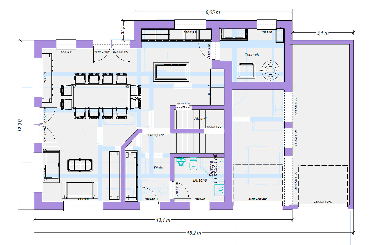 - Welche der von Dir gezeichneten Wände im EG und OG sind lastabtragend / aussteifend? Denk dran, es sind zwei Betondecken und eine lichte Weite von >6m ist meines Wissens eher suboptimal.Alle Innen-Wände sind mit 20cm Dicke immer als tragend eingeplant. Aber darüber darf sich der Statiker sein Köpfchen zerbrechen. Notfalls werden Unterzüge eingezogen. Glaube nicht, dass das nötig wäre.derpikniker schrieb: