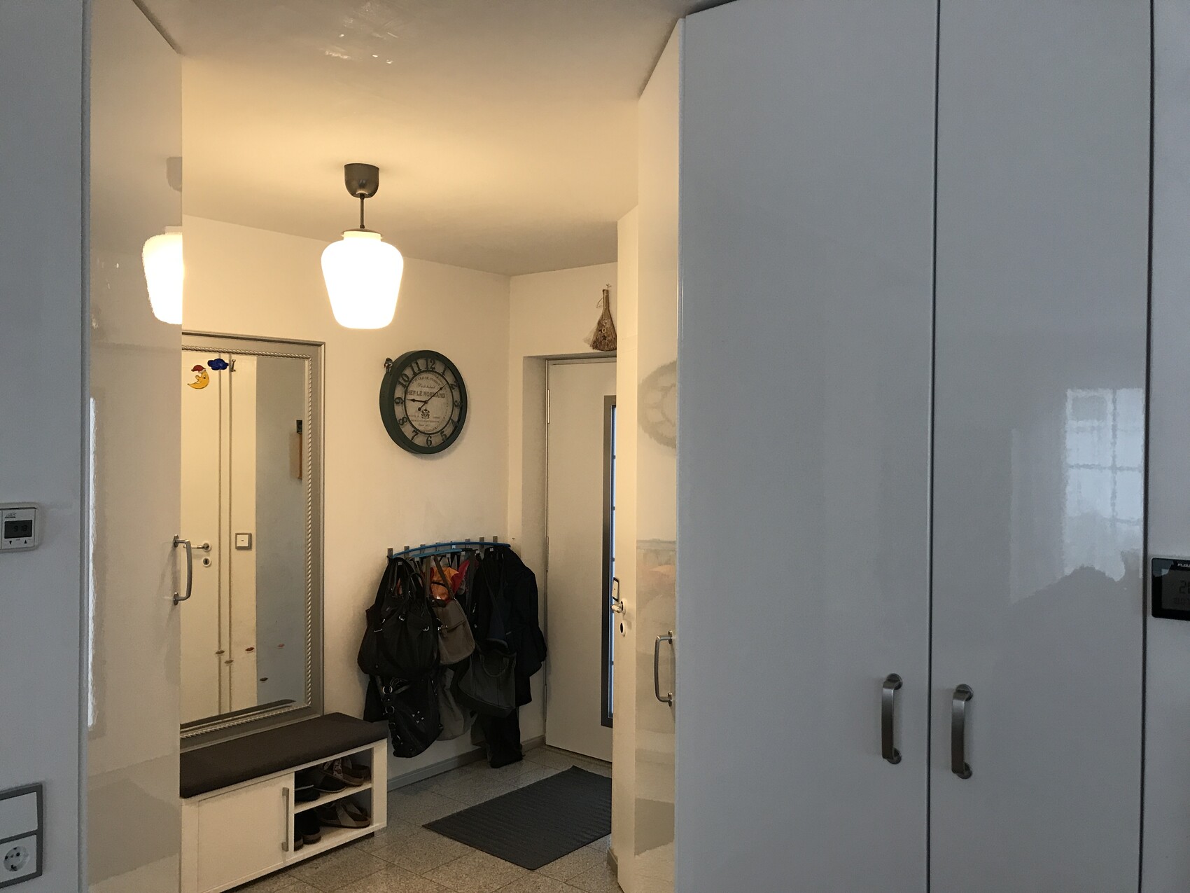 Heller Eingangsflur mit Spiegel, Uhr, Garderobe mit Taschen, Schuhbank und Tür.