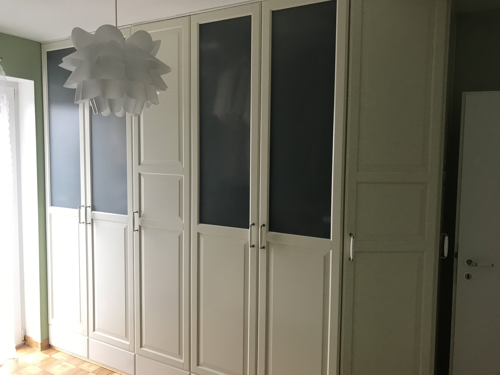 Weiße Kleiderschränke mit Paneel- und Glasfronten an der Wand; große Pendelleuchte.