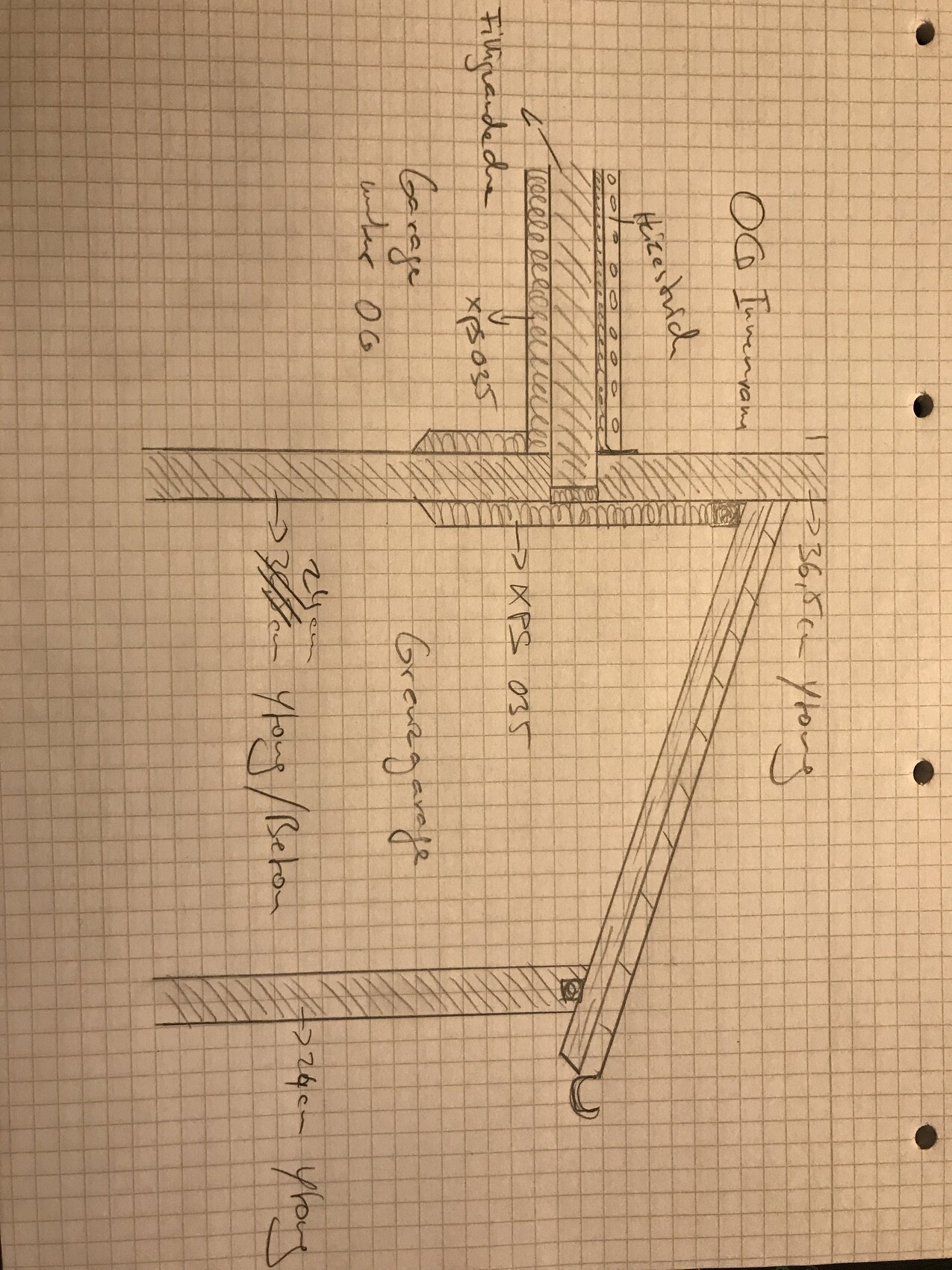 Die Grundflächenzahl bezieht sich nur auf Haus und angebauter Terrasse, nicht auf Wege und Nebenanlagen.Unbeheizte Keller liegen nicht in der thermischen Hülle eines Hauses. Das musst Du Dir ungefähr auch so vorstellen. Die Seitenwände des OG sind durch den 36,5er Vollstein 0,09 Lambda gedämmt. Die Garagendecke samt Ringanker, die nur bis zur Hälfte der Garage geht, ist von unten gedämmt. Der zweite Teil der Garage hat ein flaches Pultdach, welches an den Hauptbau anschließt. Hier die schnelle, nicht maßstabgetreue Skizze.Grundflächenzahl bezieht sich in RLP auf alle bodenversigelnden Anlagen. Es gibt nur verschiedene Quotienten für verschiedene Arten von Bauanlagen.