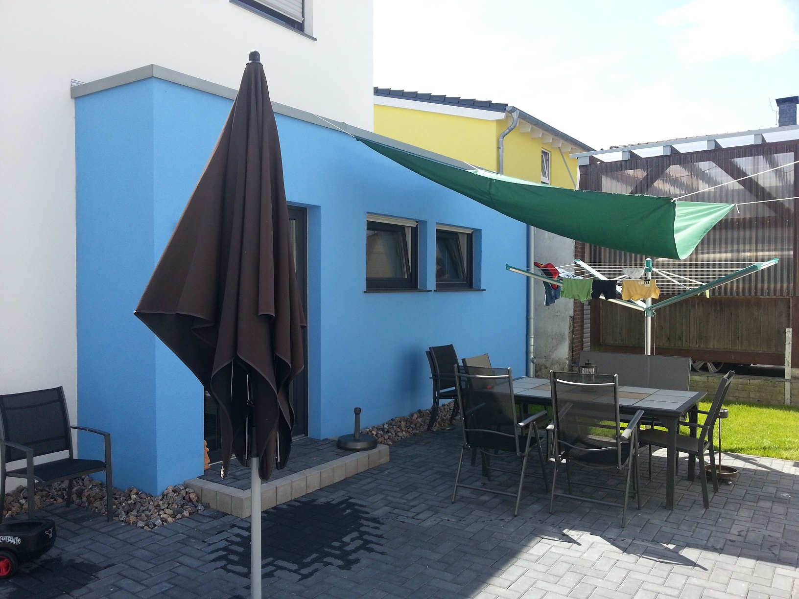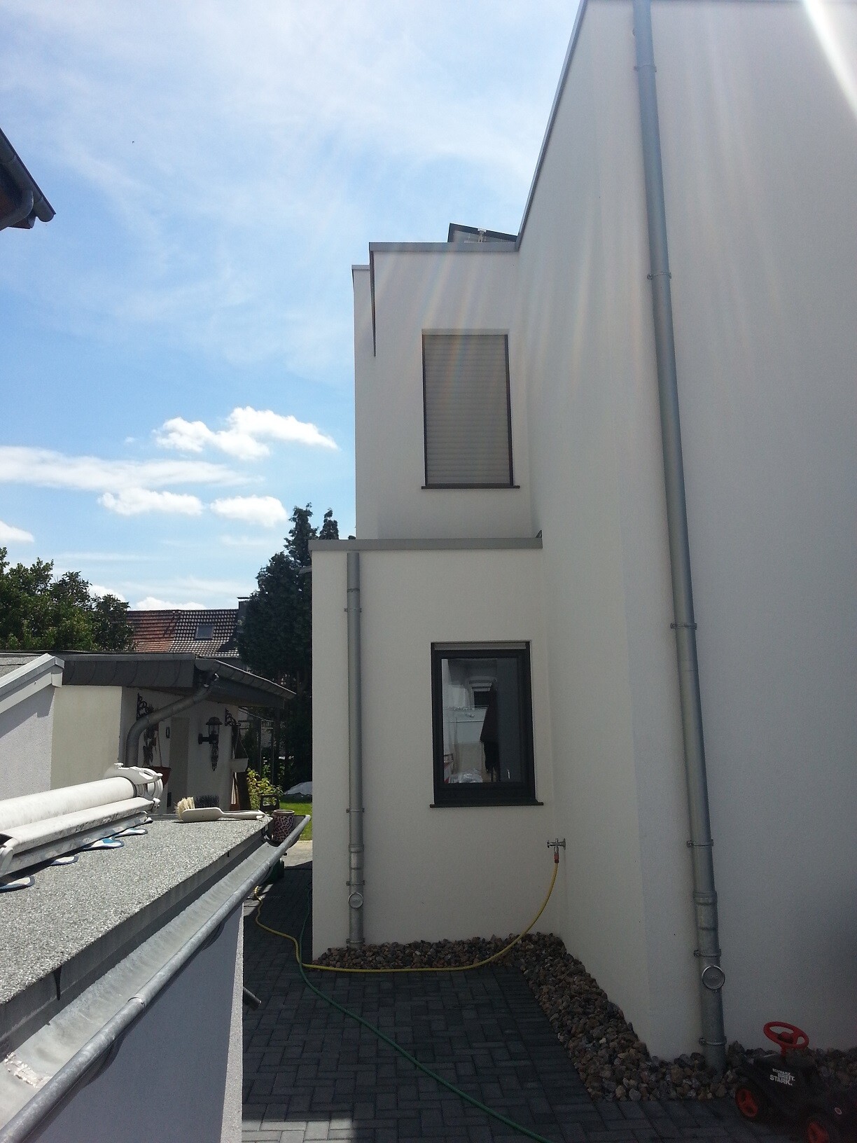 toxicmolotof03.08.15 00:10Da fehlt noch der vierte Garagenteil. Die stehen mit 5m Abstand vorm Haus mit Türe hinten raus. Und hinterm Haus haben wir noch Garten. Insgesamt sind es etwa 400qm Grund, grob 10m breit und 40m tief.