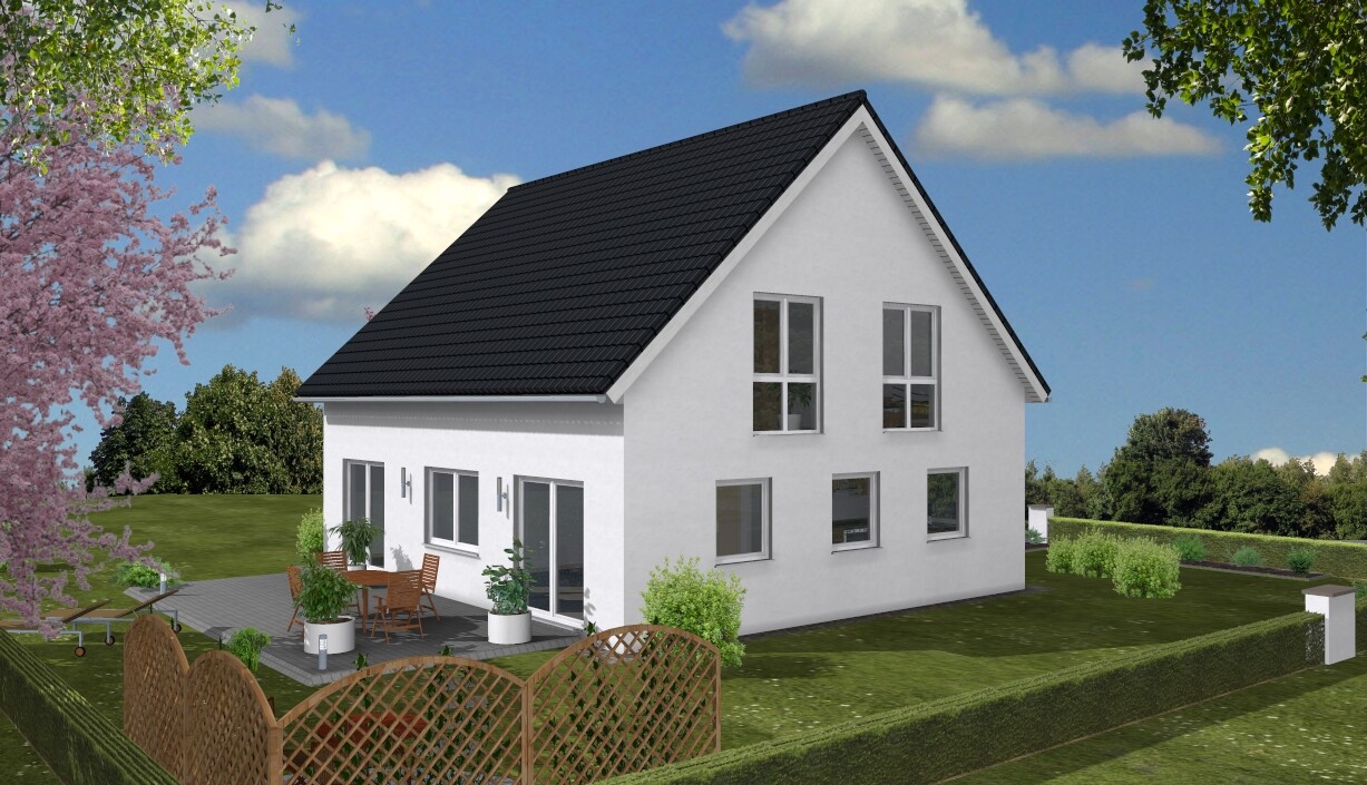 Weißes Einfamilienhaus mit schwarzem Satteldach, Garten und geparktem Auto.