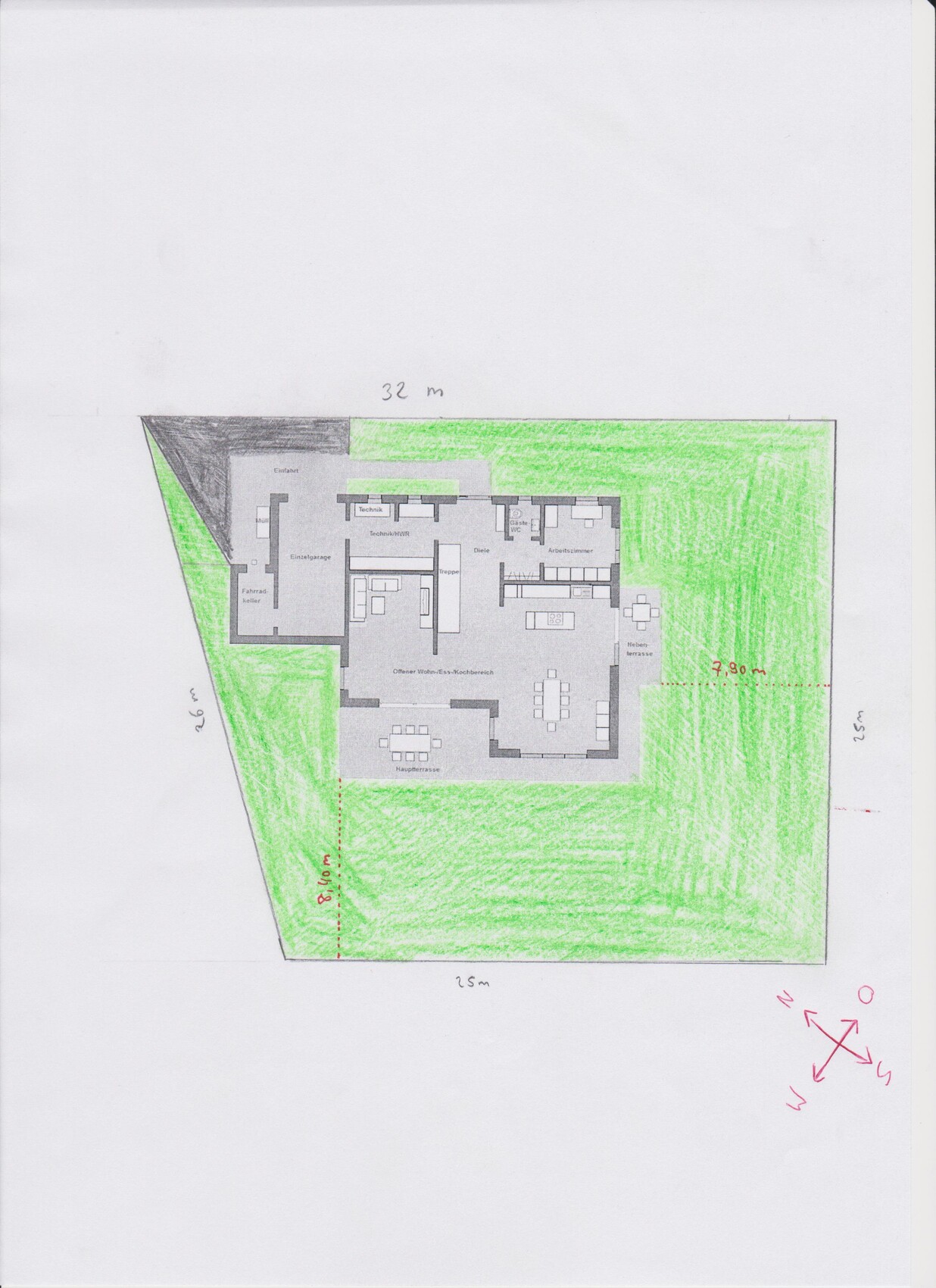 Nachfolgend erst mal - zum besseren Verständnis - die geplante Lage des Einfamilienhaus aus dem Grundstück: