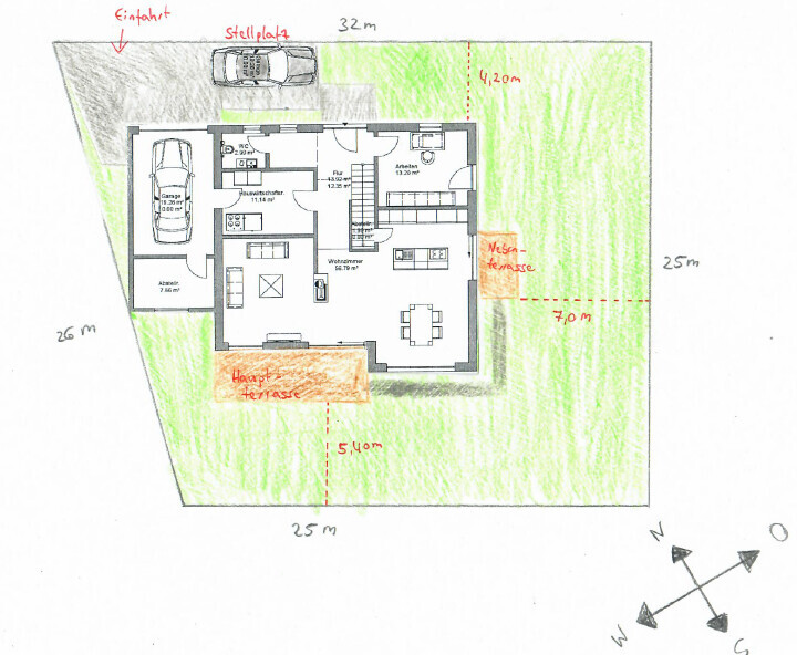 Außerdem könnte ich mir vorstellen, den geplanten Abstellraum an der Garage woanders zu erstellen bzw. modernes Gartenhaus o.ä. und damit die Option für mehr Fenster an dieser langen Wand zu schaffen; selbst wenn es nur Oberlichter/Fensterband wäre.