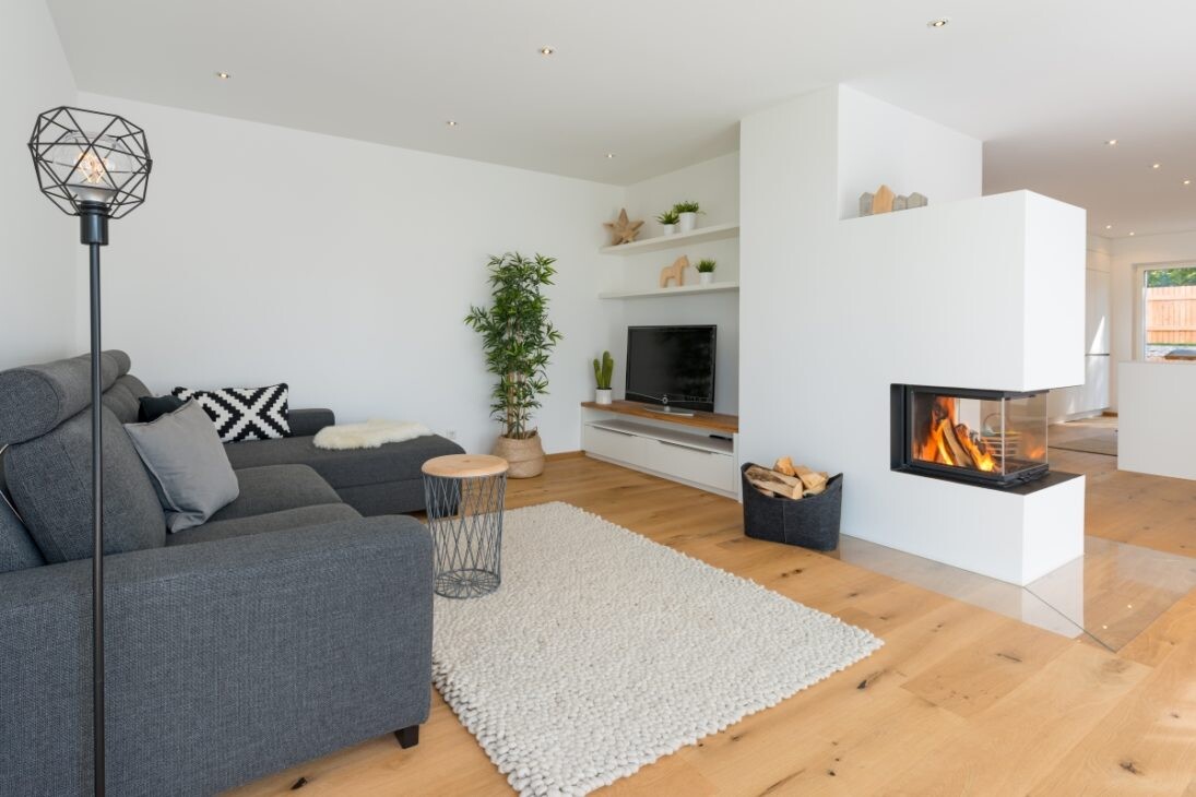 Modernes Wohnzimmer mit weißem Kamin, grauem Ecksofa, Holzboden, Fensterfront und Pflanze.