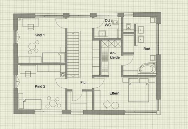 auch Dachschrägen einzeichnen! Wird oft vergessen, womit Räume im OG deutlich größer wirken, als am Ende reale Stellfläche vorhanden sein wird.