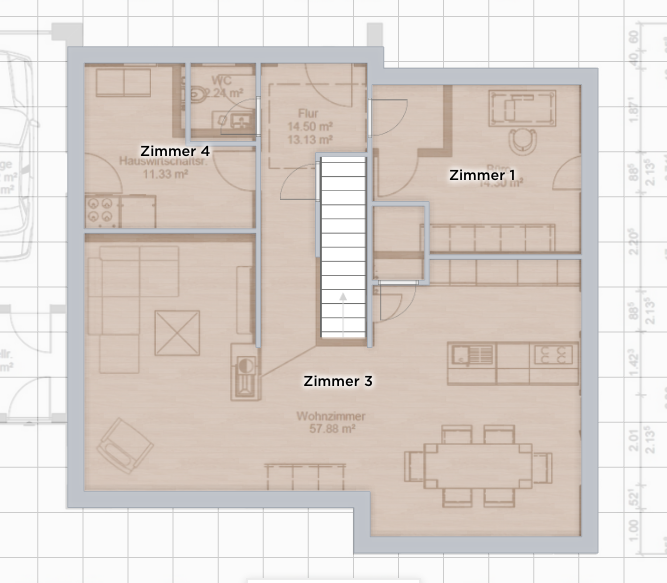 Allerdings wird m. E. der Eingangsbereich doch recht eng und die hohe WandVerschieb doch mal die Treppe nach planrechts, so 60cm... und verschieb Deine mittige tragende Wand, also die Ecken am Eingang und Essbereich. Nimm dadurch die Treppe aus dem Flur und mach diesen etwas schmaler... Wäre ein Antritt der Treppe auf 90 Grad geschmacklich möglich bei Euch?