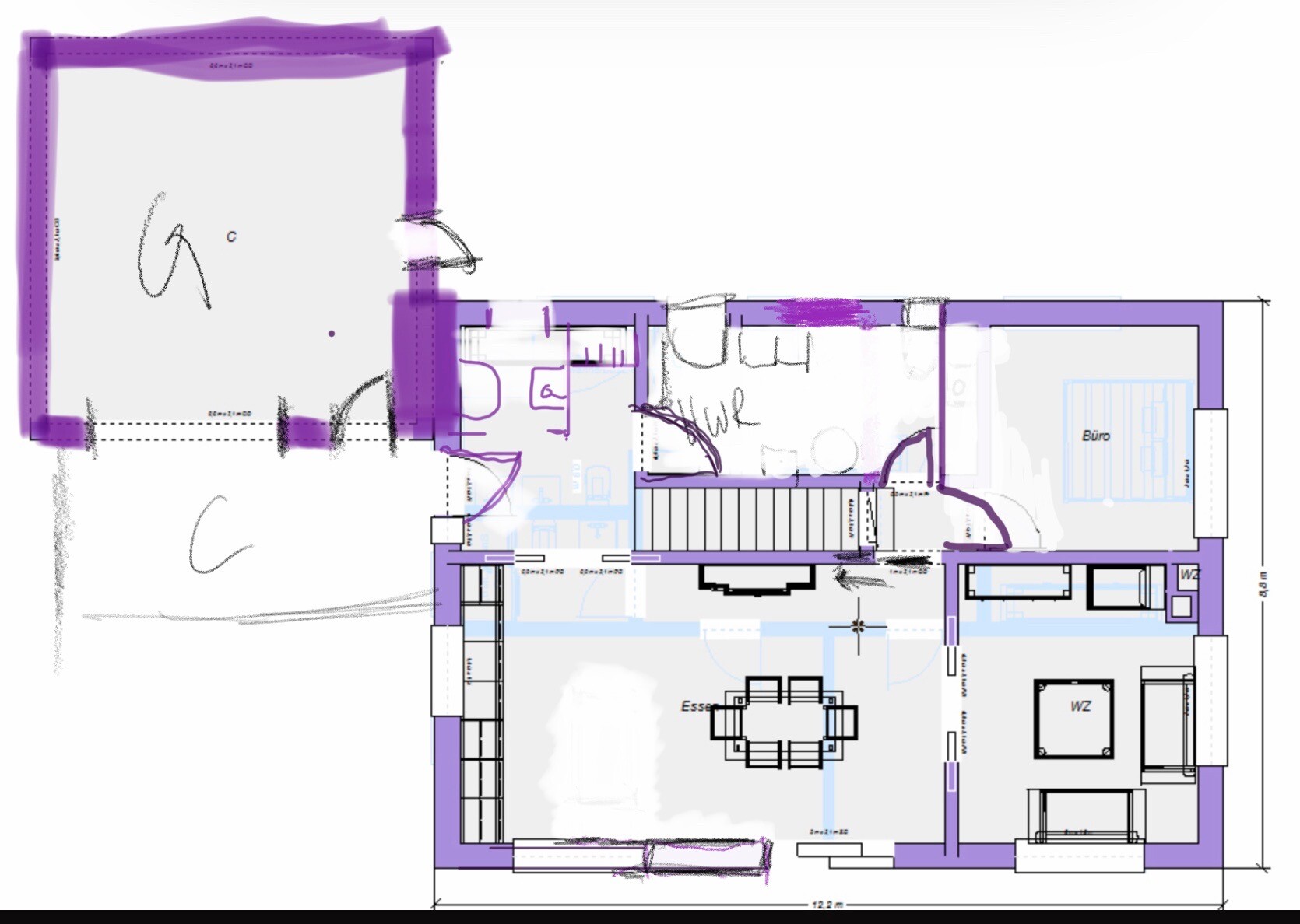 Durchgang Hauswirtschaftsraum zu Garage ist raus. Dafür haben wir uns auf dem iPad folgendes gedacht, ohne Treppe und OG zu ändern.