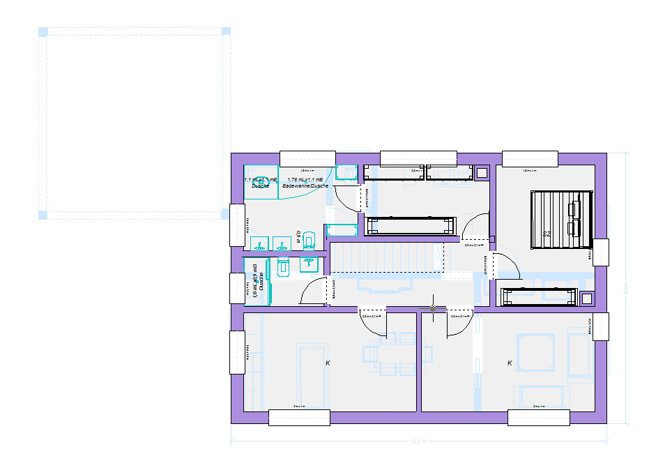 Alle Erker gekillt und Räume im Haus untergebracht. Breite erhöht, dafür Tiefe verkleinert. Kinder haben die Südseite - allerdings eins mit Ohr zum Schlafzimmer - evtl. Wand dicker machen. Zugang für Kiddis zum Masterbad + Wäscheschacht.