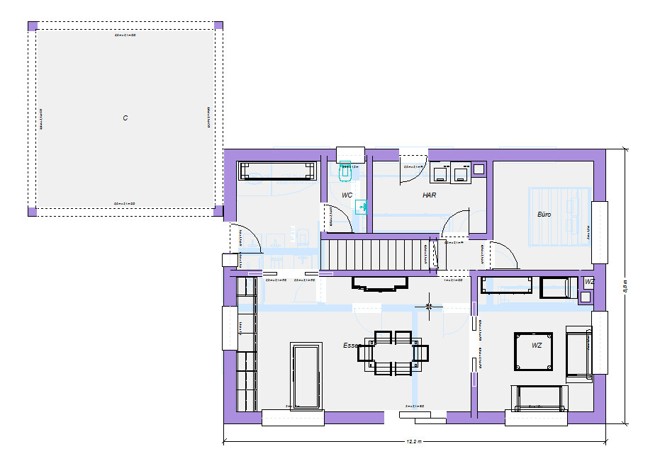 Grundriss eines Hauses mit Wohnzimmer (WZ), Esszimmer, Büro, HAR, WC, Treppe und linker Anbau.