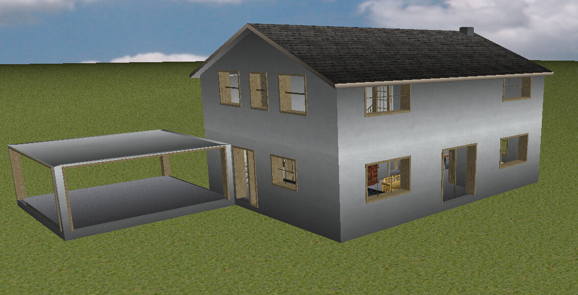 Zweistöckiges Haus mit grauer Fassade, Fensterfronten und offener Carport neben grünem Rasen.