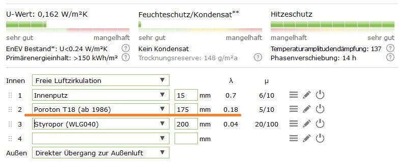 0,18 W/mK beim T18 sind ein Witz und daher spreche ich hier auch nicht von einer Wärmeleitfähigkeit des Poroton T18. Eine Wärmeleitfähigkeit hat für mich ein Stein der entsprechend auch als Ersatz für ein WDVS dienen könnte. Ob nun sinnvoll und gefüllte Porotonsteine gut sind oder nicht lasse wir mal Außen vor.