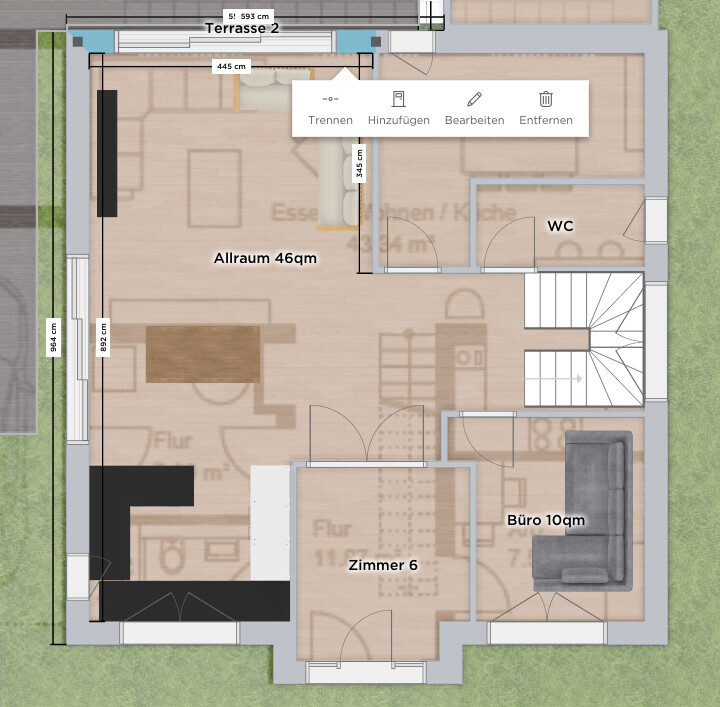 - Zugang Arbeiten nur über Wohnzimmer, die Tür zum Wohnzimmer könnte eine große Schiebetür sein um Ostlicht in den Allraum zu bekommen