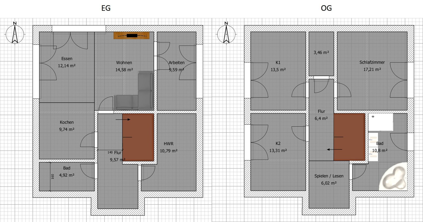 - Oben kann der Bereich mit den Südfenster als offener Spielraum genutzt werden. Später vielleicht als "Leseecke"