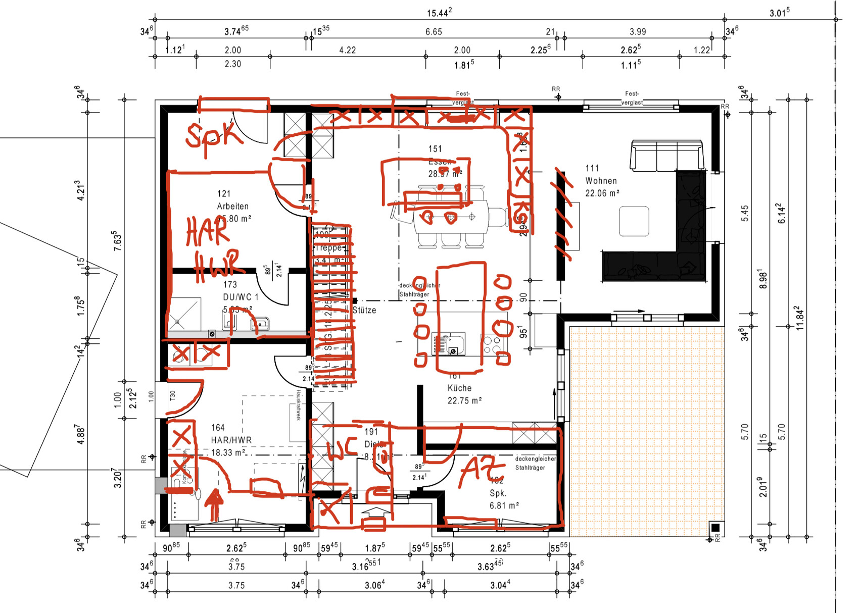 Wir haben das EG mal grundsätzlich umgeplant (natürlich laienhaft) und werden den Fertigbau-Architekt bitten, das mal im Plan umzusetzen.