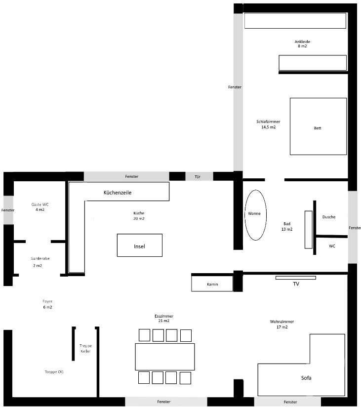 Badezimmer en suite fehlt mir völlig die Fantasie, wie man das aufbauen könnte auf so einem RaumEin Durchgangsbadezimmer... hatte ich tatsächlich mal vor 15 Jahren in einem Hostel in Warschau. Das angrenzende Zimmer hatte aber jemand fremdes gemietet. Egal.Ich würde lieber oben links einen Miniflur abtrennen, oder sonstwie das Badezimmer verkleinern, um auf jeden Fall das Durchgangszimmer aufzulösen.