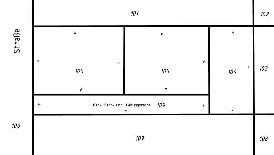 Das große Grundstück ist in drei Teile geteilt und die beiden hinteren Grundstücke mit einem Geh-, Fahr- und Leitungsrecht versehen.