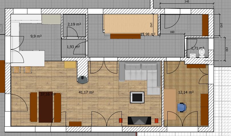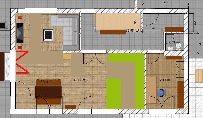 Die andere Einteilung von Küche und Wohnzimmer hatte ich mir auch mal überlegt und ist sicher auch keine schlechte Wahl. Aber mir hat das Wohnzimmer immer nicht so gefallen und vor allem hätte ich gerne die Möglichkeit das Wohnzimmer mit zum Beispiel einer Schiebetür noch abzutrennen. Das geht so nicht mehr.