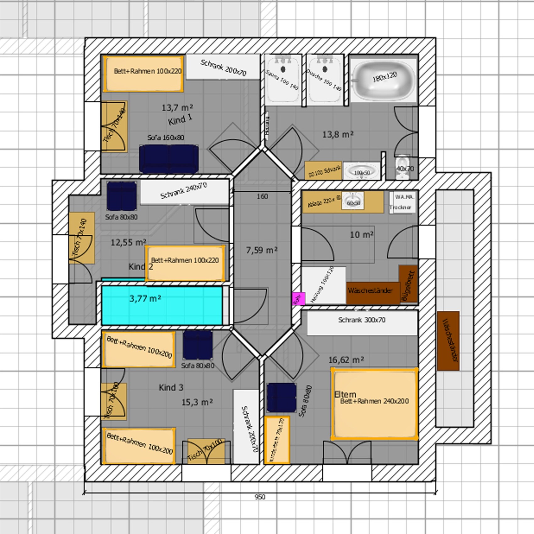 In Kind Zimmer 3 sollen auch Küchenanschlusse sein so das man später eventuell oben eine Küche unterbringt und die Wand zwischen Kind 3 und Eltern herausnimmt so das im OG ein Wohn/Essbereich entsteht. Wäre diese Idee gut?Wo willst Du im EG die Teilung vornehmen, daß oben eine separate Wohnung entstehen könnte ?schustrik schrieb: