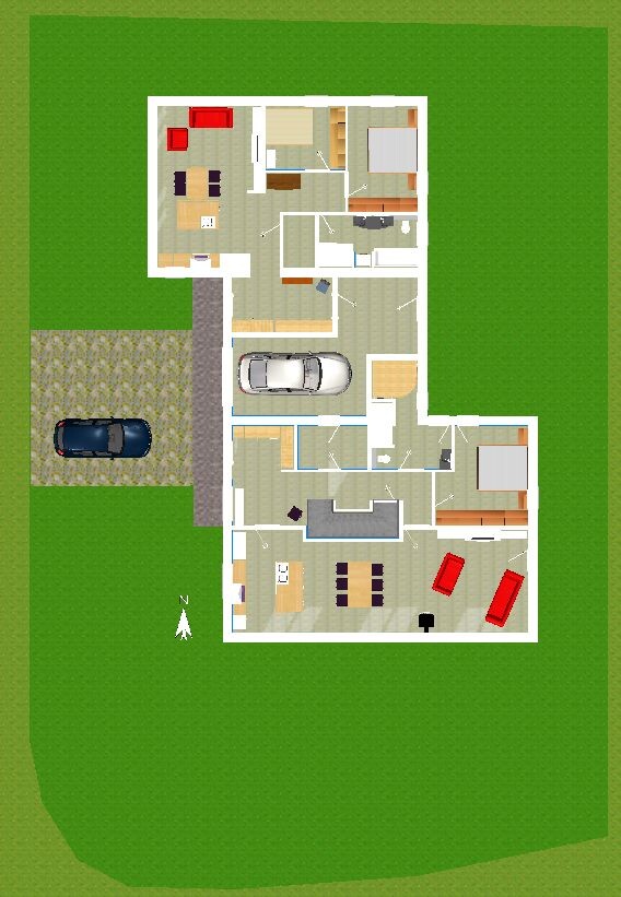 -> Garage an die Nordgrenze, Grenzbebauung. daneben Eingang Einliegerwohnung, die sich nach hinten zieht, WZ/Terrasse Rtg Süd/Ost. Mittig Haupthaus mit Terrasse im SW...