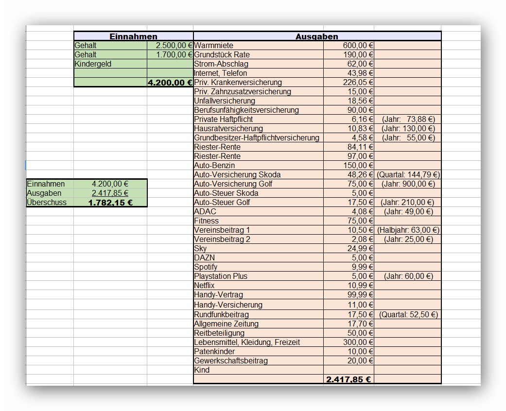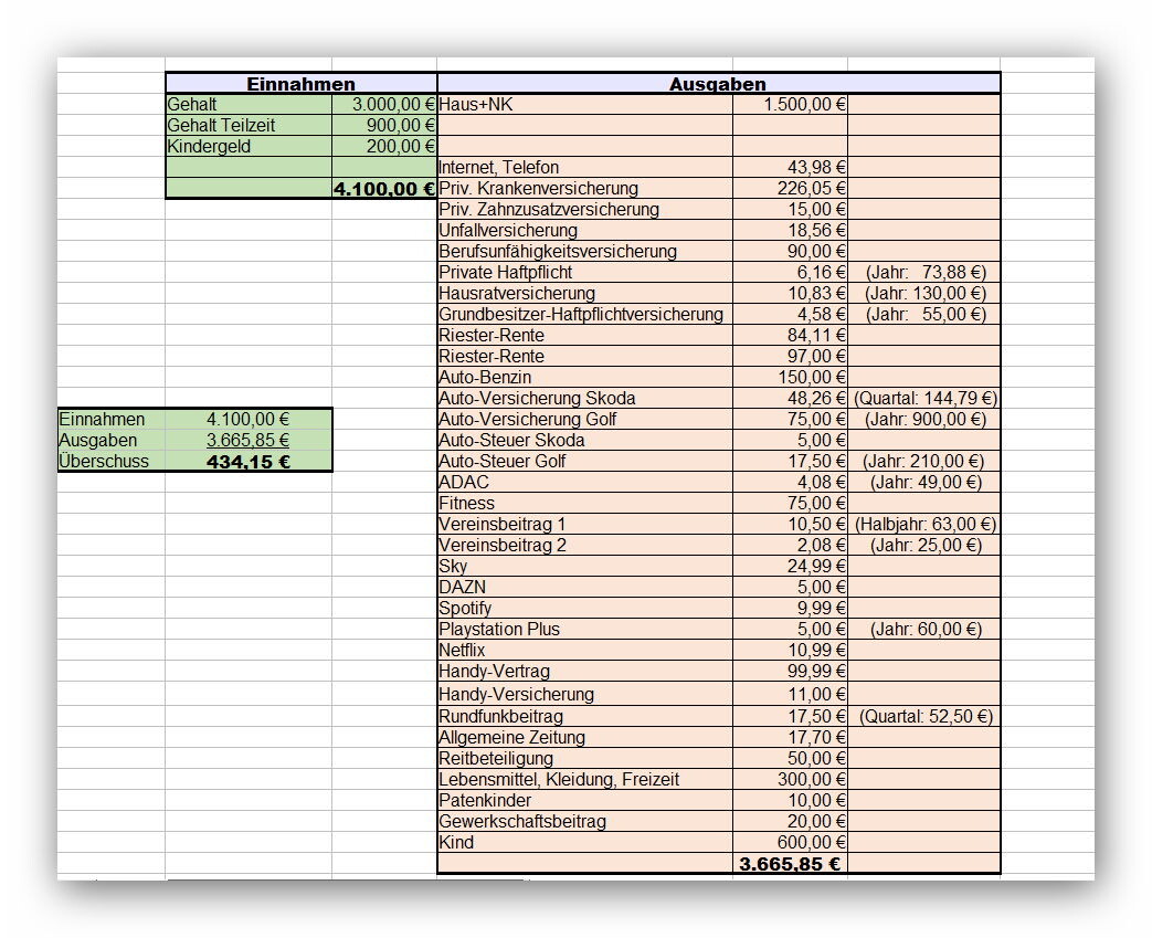 2. Tabelle für später, also mit Teilzeit-Gehalt, Kindergeld, Hausrate + Nebenkosten, Kosten für Kind.
