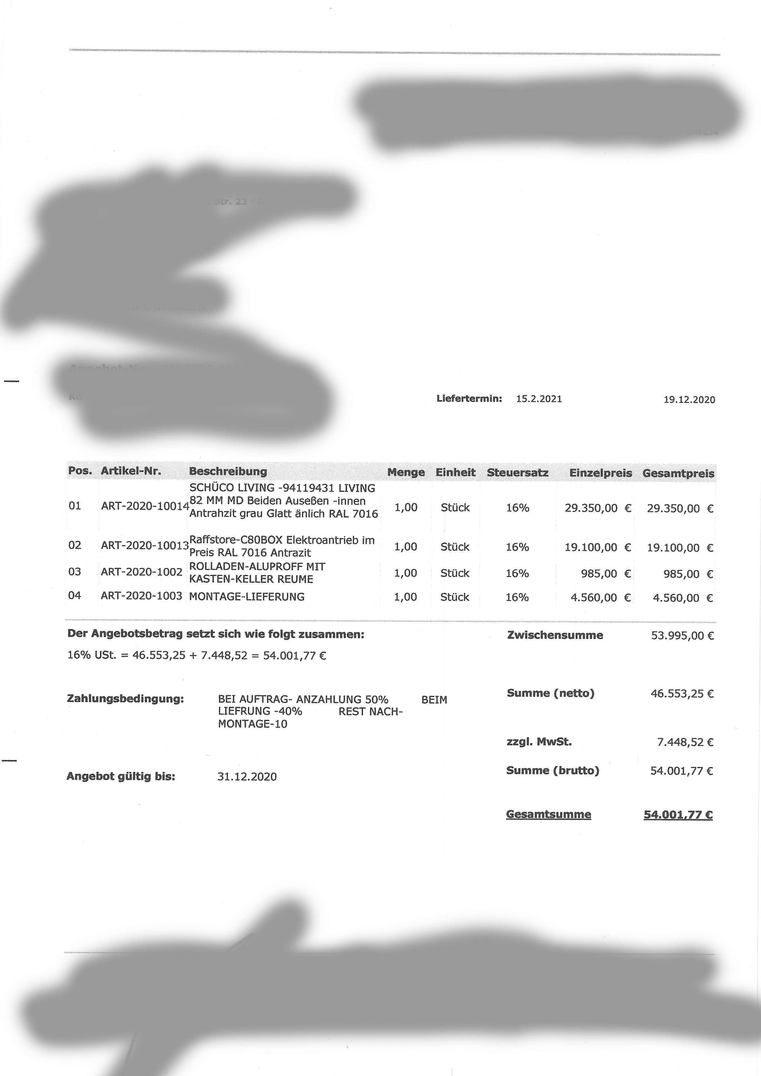 Das Angebot "ang1" ist eine maßlose Unverschämtheit. Schreibfehler geschenkt, aber: bei vierundfünfzig Mille (!) sind ganz abgesehen von den Konditionen (den Vogel schießt die zwölftägige Angebotsbindung ab !) die Lose "alle Elemente" und "alle Raffstores" jeweils als Sammelposition freundlich gesagt unprofessionell - da will ich daraus gar nicht auf die Qualität des Einbaues hochrechnen :-(