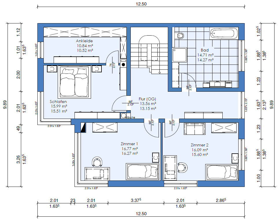 Das Bad im OG ist nur groß, unnütze Mittelfläche, das geht schöner.