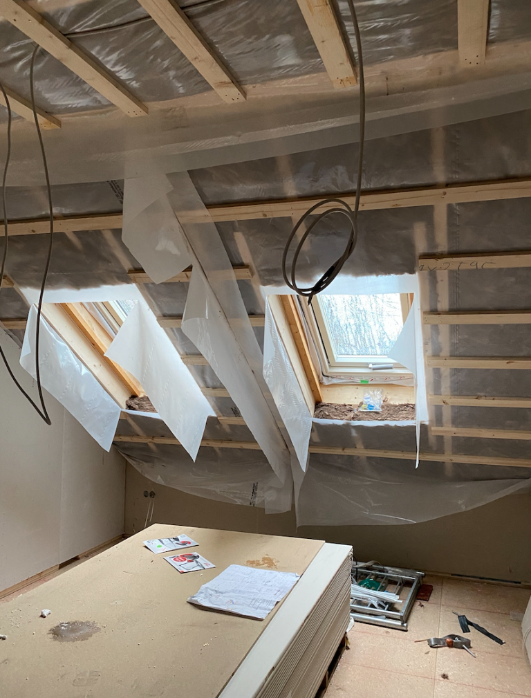 Dachboden-Bauarbeiten: Dachfenster, Folie, Holzrahmen, Werkzeuge, Baupläne.