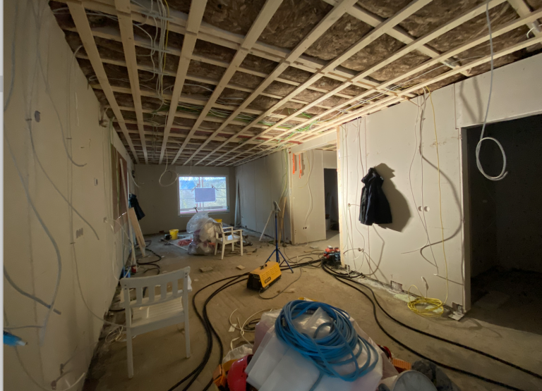 Renovierungsraum: offene Decke, Kabel, Werkzeuge, Materialien und Möbel verteilt.