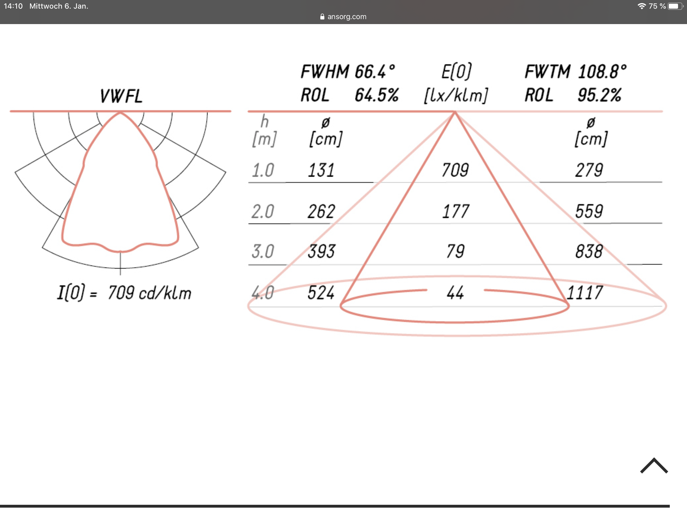 Lichtverteilung Diagramm einer Lampe mit Polar- und Kegeldiagramm in roter Farbe