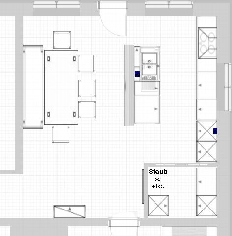 letzter Stand: ja, der letzte Stand gefällt mir immer noch recht gut. Ich finde die Küche an der Wand zu lang und würde die Hochschränke auf 3x60 beschränken (Geschirrspüler, Kühlschrank, Backofen), ohne Vorrat.