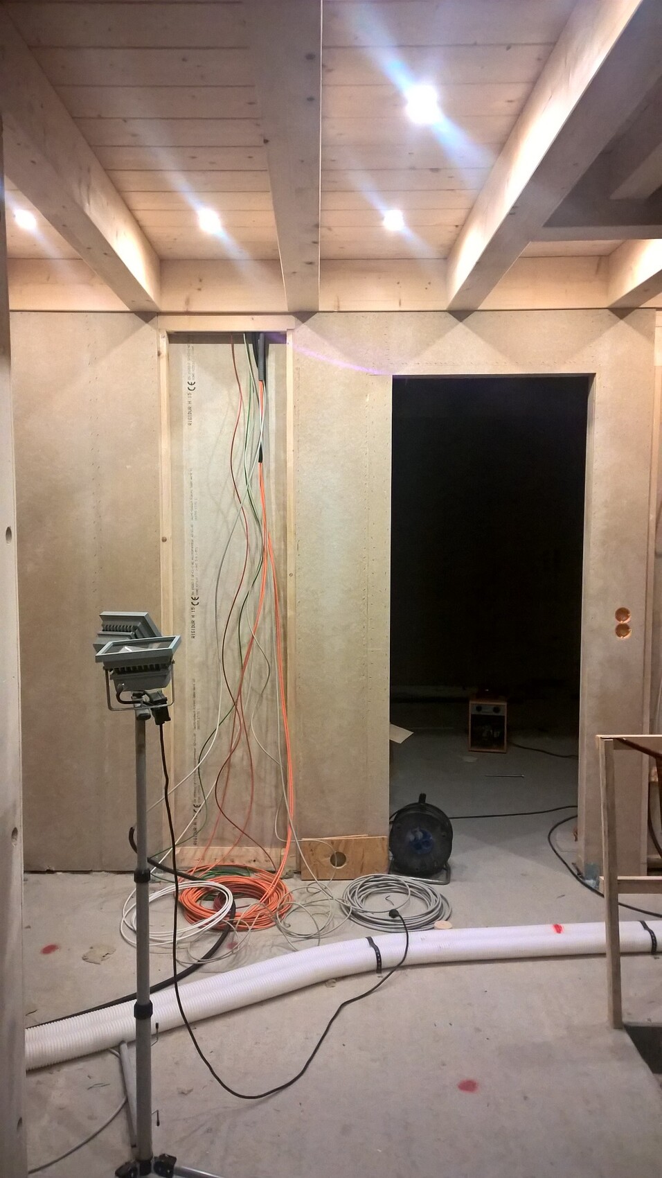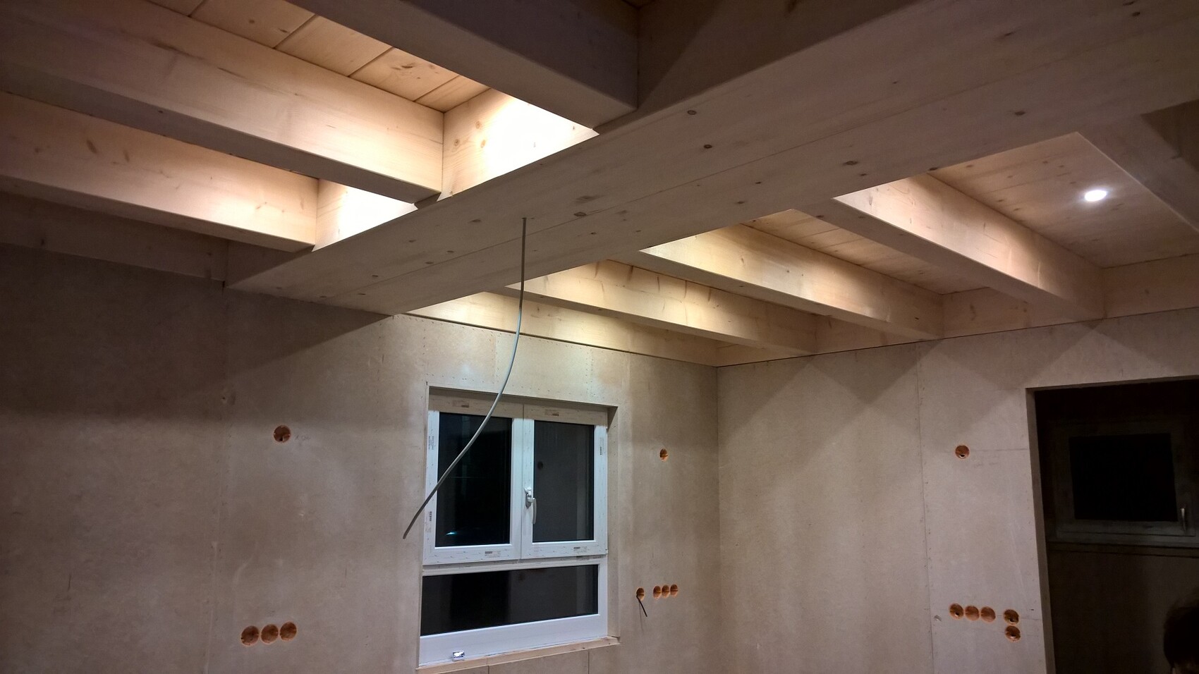 Generell würde ich diesen Spotwahn mal überdenken. Ein paar in den Flurbereichen haben wir auch, aber würde wesentlich mehr auf Wandleuchten setzen, die echte Stimmung verbreiten.Völlig richtig. Wir haben es im Flur und in der Küche aufgrund des minimierten Schattenwurfs gemacht und weil es mit der Holzdecke wirklich gut aussieht. Hab mal ein Bild vom Flur und von der Küche angehängt, allerdings im Rohbau:Aber wie gesagt, das sind 10 in der Küche und 8 im Flur. Ansonsten gibt's noch einige Wandleuchten an den Treppen und im Wohnbereich.