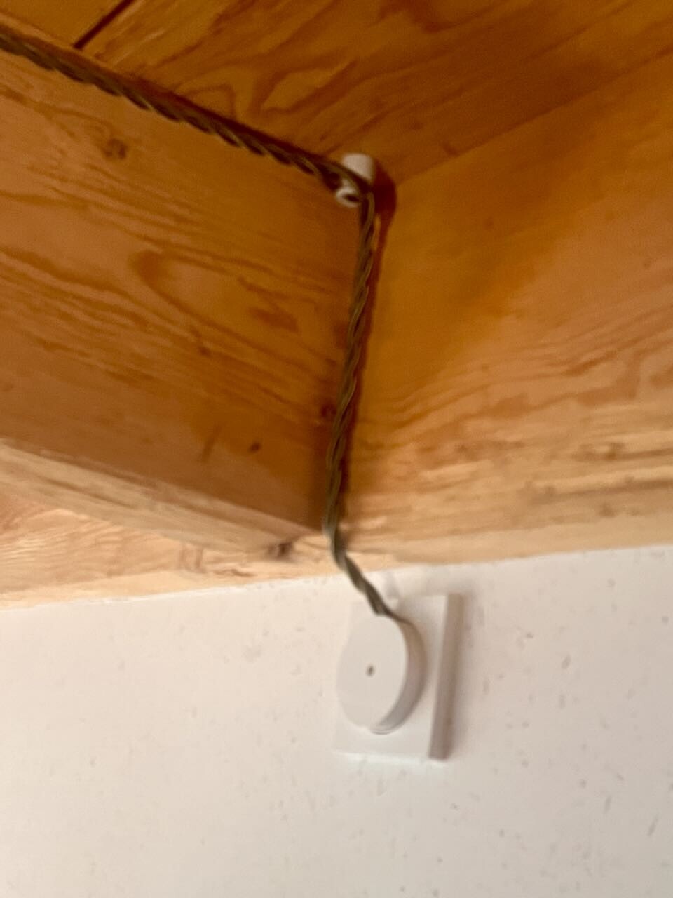 Kabel läuft über Holzbalken zu einem weißen runden Schalter an der Wand.