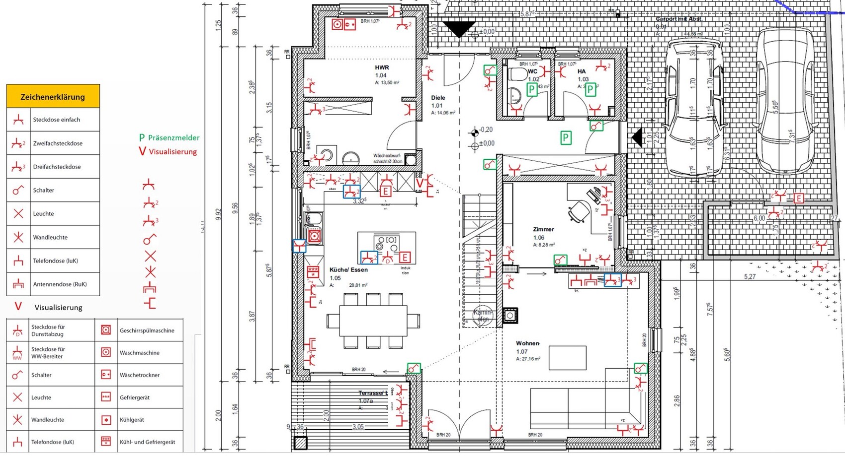 Alle Steckdosen im Außenbereich (Terrasse und Carport inclusive Geräteraum) würde ich schaltbar machen. LAN auf Terrasse extra sichern gegen fremde Benutzung.