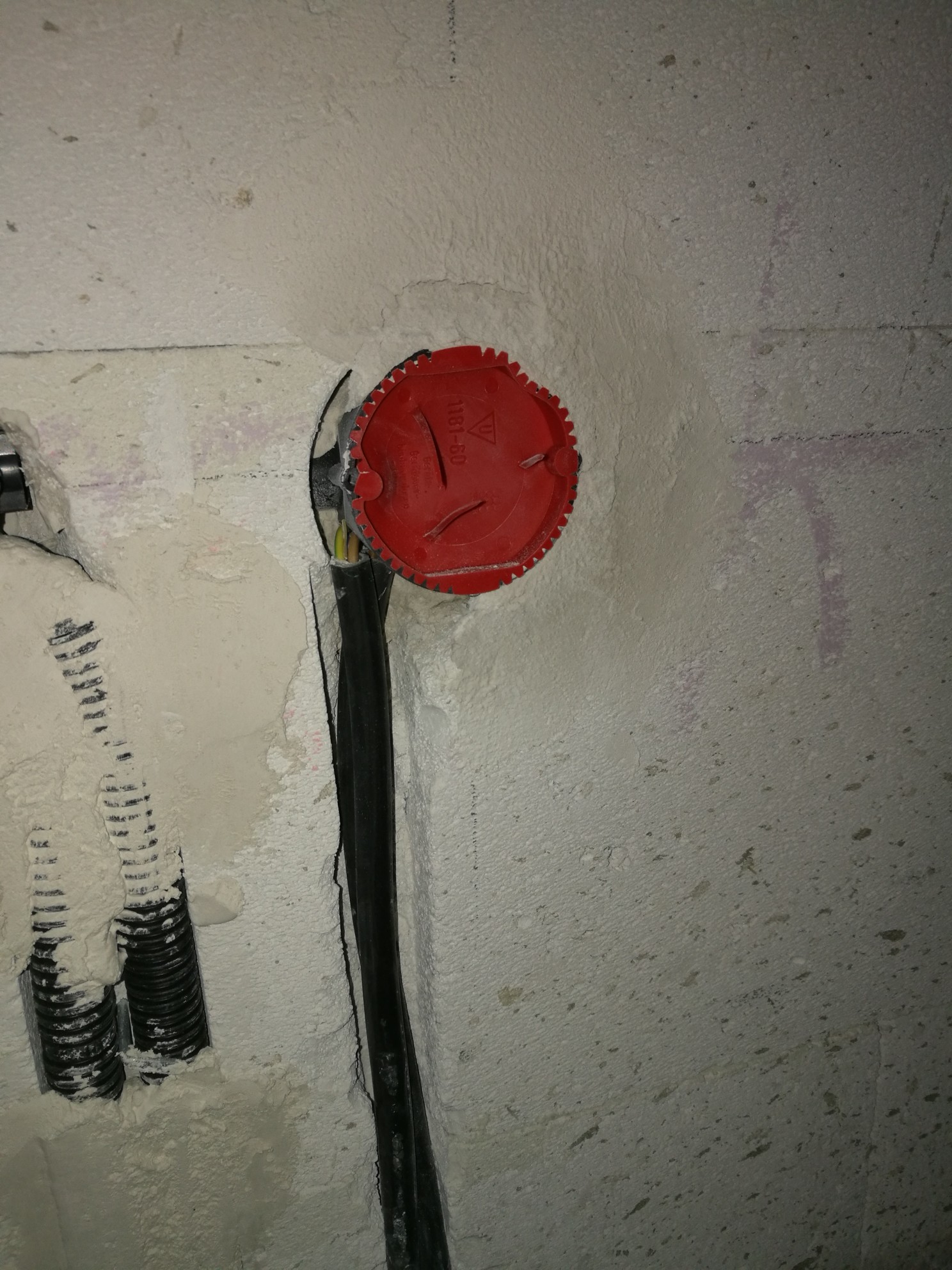 Rote runde Elektro-Dosen im Rohbau mit sichtbaren Kabeln
