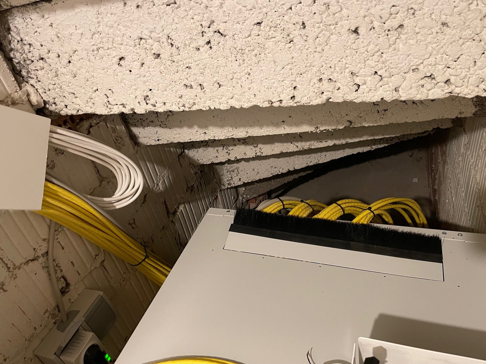 Gelbe Kabelbündel und weiße Kabel neben einer weißen Technikplatte in einem kellerartigen Raum.