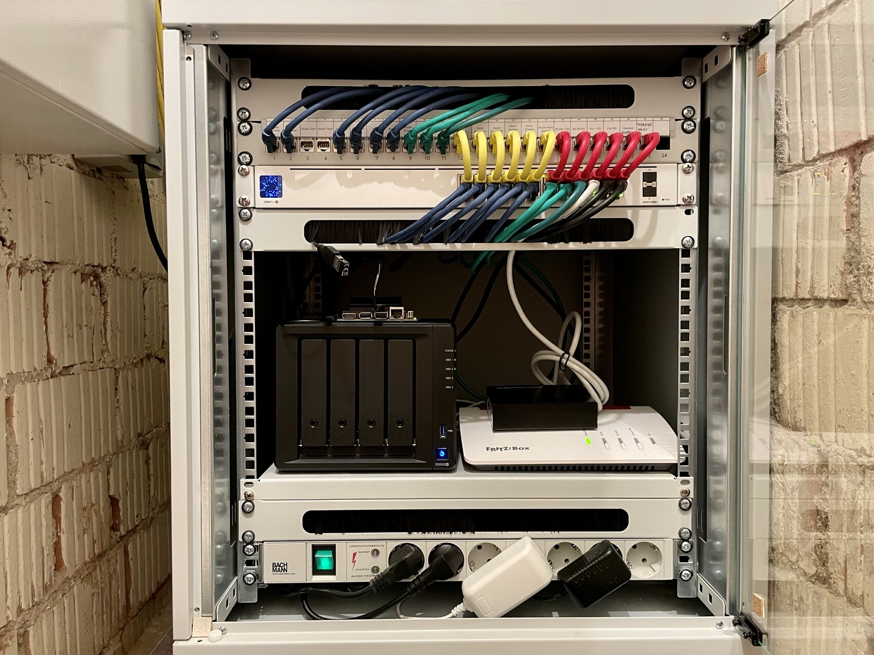 Insgesamt führen so 23 Verlegekabel zu einem Patchpanel in einem kleinen Abstellkammer im Keller. Dort steht dann auch ein 19"-Netzwerkschrank, in dem ich die restliche Infrastruktur zusammenführe: