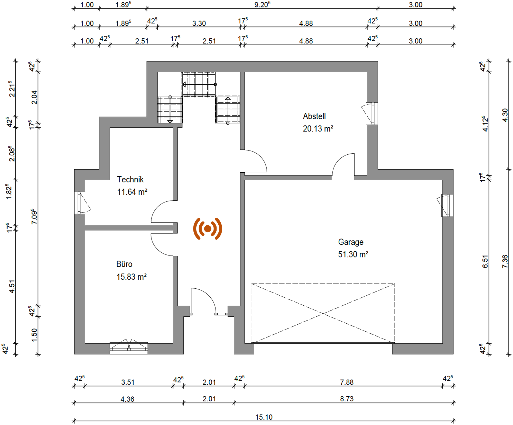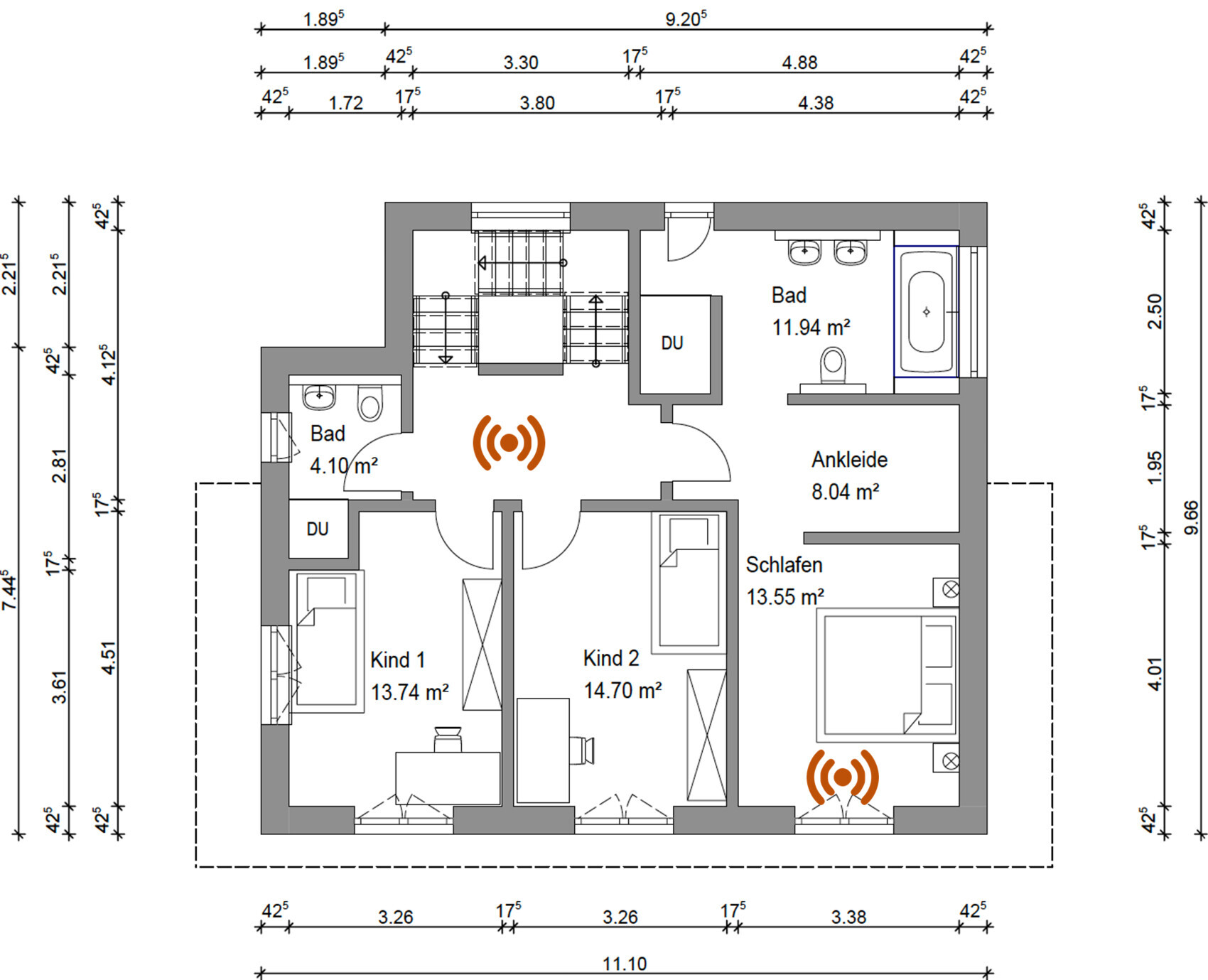 Wenn ich an Deiner Stelle die Access Points einplanen müsste, würde ich wahrscheinlich an folgenden Stellen an den Decken die APs setzen lassen. Am schwierigsten erschien mir das OG mit den drei Zimmern in Reihe. Da könnte man sich ja mal einen Anschluss in die Decke im Schlafzimmer setzen lassen. Falls man dort keinen Accesspoint braucht, kann man einen Blinddeckel drüber setzen. Und im UG könnte man alternativ den Accesspoint auch direkt ins Büro (auf Höhe der Tür) an die Decke setzen lassen.