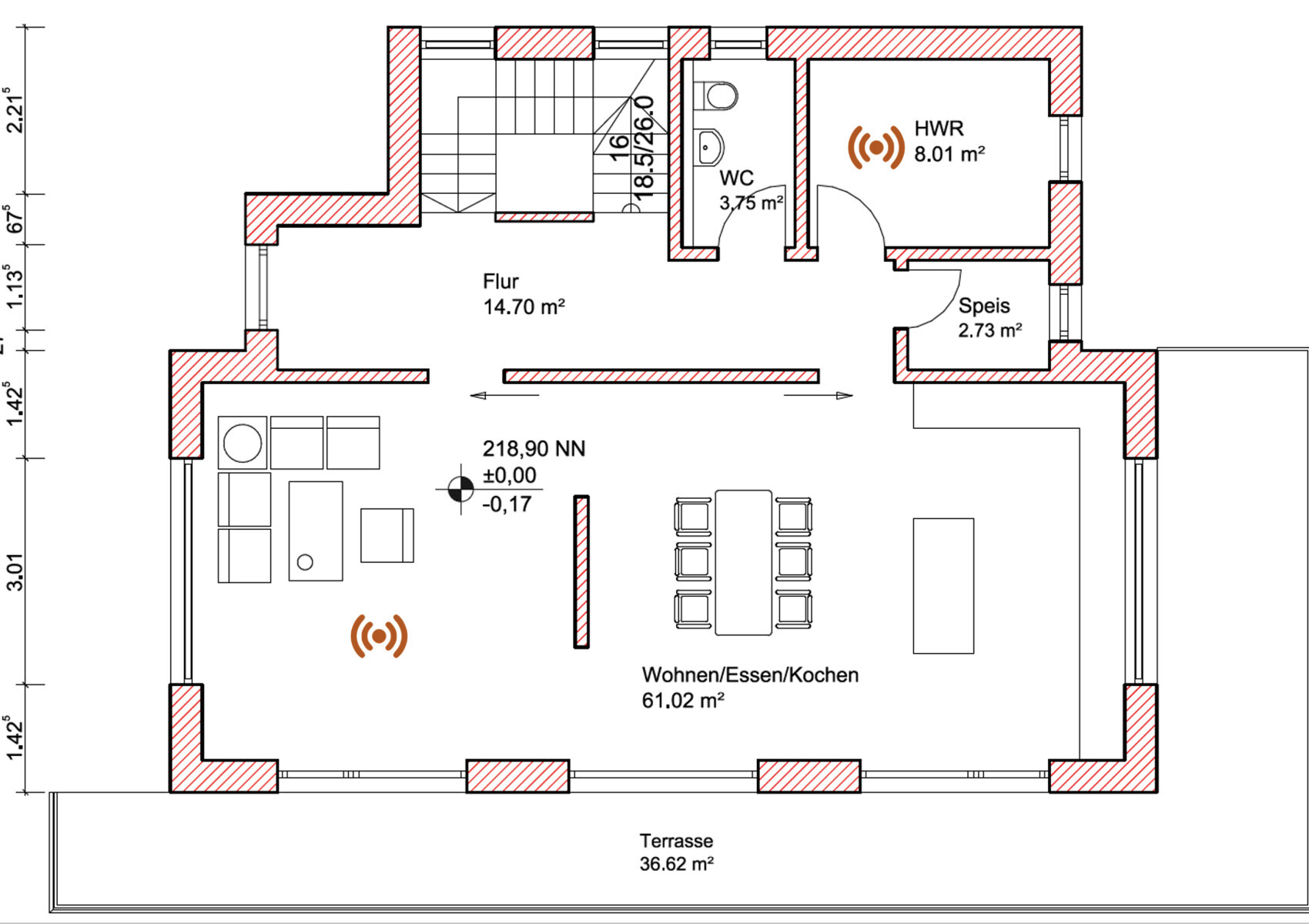 Das macht Sinn. Die Terrasse ist nach Süd-Westen ausgerichtet. Dementsprechend werden wir dort viel Zeit im Sommer bei geschlossenen Raffstores verbringen. Das würde aber einen dritten Accesspoint oder den Verzicht des Accesspoint im Hauswirtschaftsraum bedeuten.