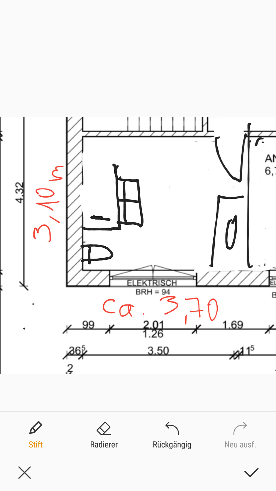 Die schraffierten Wände sollten raumhoch gemeint sein, ansonsten sollten Höhen dranstehen. Üblich sind Grundrisse so gemeint, als sähe man aus 1 m Höhe auf den Boden.
