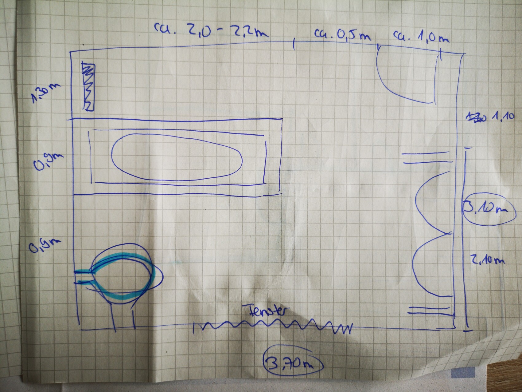 Somit optimal um die Anordnung an die längere Wand zu stellen. Badewanne dann planoben links in der Ecke.