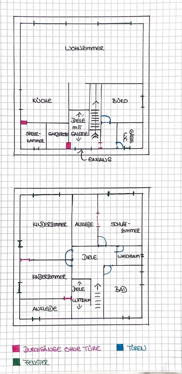 : Der Entwurf/Zeichnung meiner Frau ist unten angehangen. Hoffe auf Eure Kritik 🙂 Maßstab ein Kästchen 50cm ca.