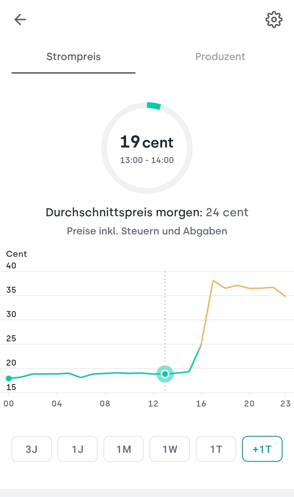 Strompreis-Übersicht: 19 Cent für 13:00 - 14:00 Uhr; Diagramm zeigt Tagesverlauf, morgen 24 Cent.