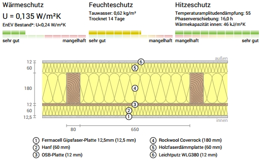 Die ursprüngliche Wand hatte einen U-Wert von 0,135 und 60mm Holzfaserdämmplatte und ist so der Wandaufbau, der von der Zimmerei "vorgeschlagen" worden ist. Allerdings reicht es so nur für KfW55. Deswegen hat der Energieberater die Wand dementsprechend geändert, so, dass ein U-Wert von 0,11 herauskam ("Wand_Thermofibre.pdf"), um auf KfW40 zu kommen. Allerdings sind hierbei Änderungen vom Ständer nötig, was aufwendig und teuer sein wird. Deswegen meine Idee, dass man doch auch die Holzfaserdämmplatten auf 120mm verdoppeln könnte, um so auch auf einen U-Wert von 0,11 zu kommen, ohne dass der Ständer geändert werden muss.