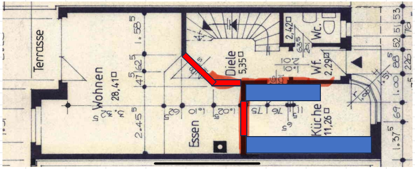 Bei Gelegenheit Versuch ich mal so die Grundidee der Küche und Einrichtung zu skizzieren. Die Stufe zum Wohnzimmer gibt es nicht. Nach dem Bauantrag zu urteilen sollte das Wohnzimmer ursprünglich nicht unterkellert sein, wurde nachträglich in einer Anpassung dann um diesen erweitert.