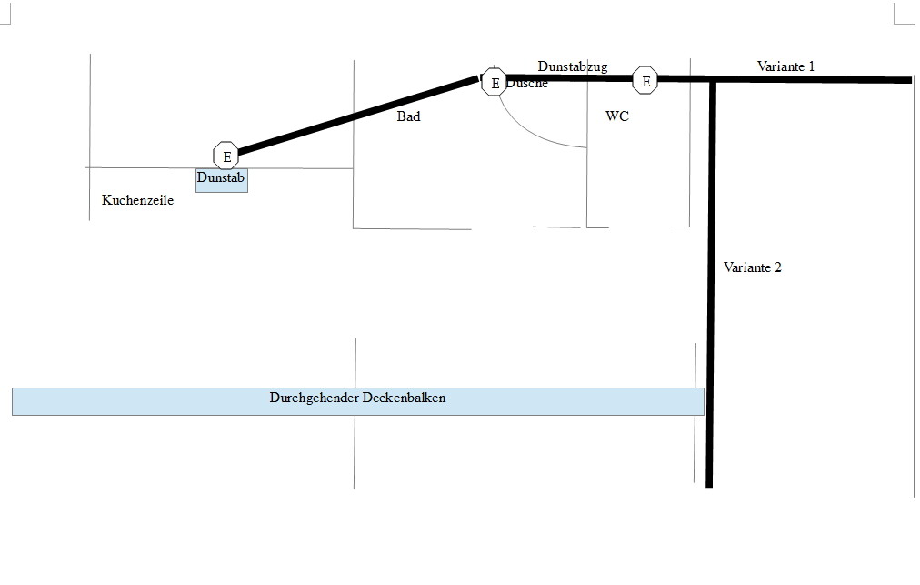Zur Entlüftung des Bades (ca. 6qm) und WC (ca. 3qm) sollte auch noch eine Dunstabzugshaube für die Küche miteinbezogen werden. Bei dem Haus handelt es sich um einen Altbau. Leider kann ich mit einer möglichen Entlüftung nicht den direkten kurzen Weg zur parallel verlaufenden Hauswand nehmen, da durch die Decke ein tragender Deckenbalken verläuft. Ebenso ist eine Dachentlüftung nicht möglich, da sich im Obergeschoss noch eine Wohnung befindet. Aufgrund einer niedrigen Unterbauhöhe kann ich wahrscheinlich maximal ein Flachkanalsystem in der Decke unterbringen. Die gesamte Länge zu einem möglichen Wandaustritt beträgt ca. 8 Meter (wenn möglich, evtl. aber verzichtbar könnte ich zum Ende hin noch einen 90°-Abzweig einbauen).