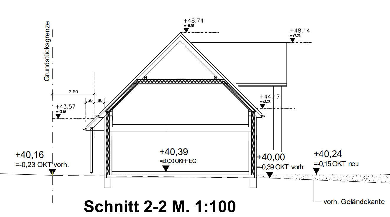 Schnitt 2-2 M. 1:100: Haus mit Dachkonstruktion, Wänden, Fundamenten und Geländekante.