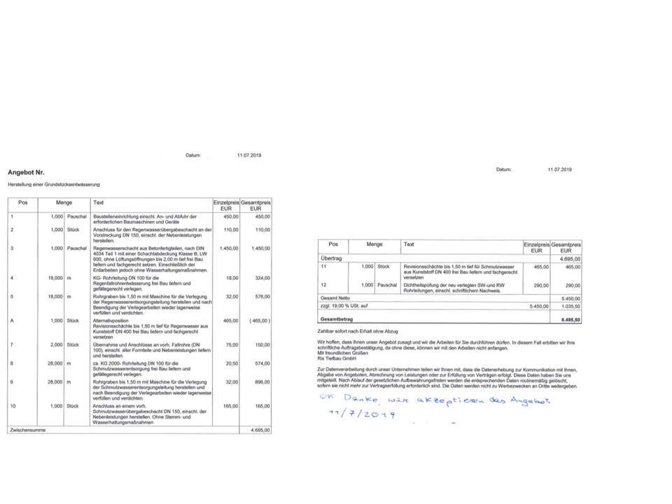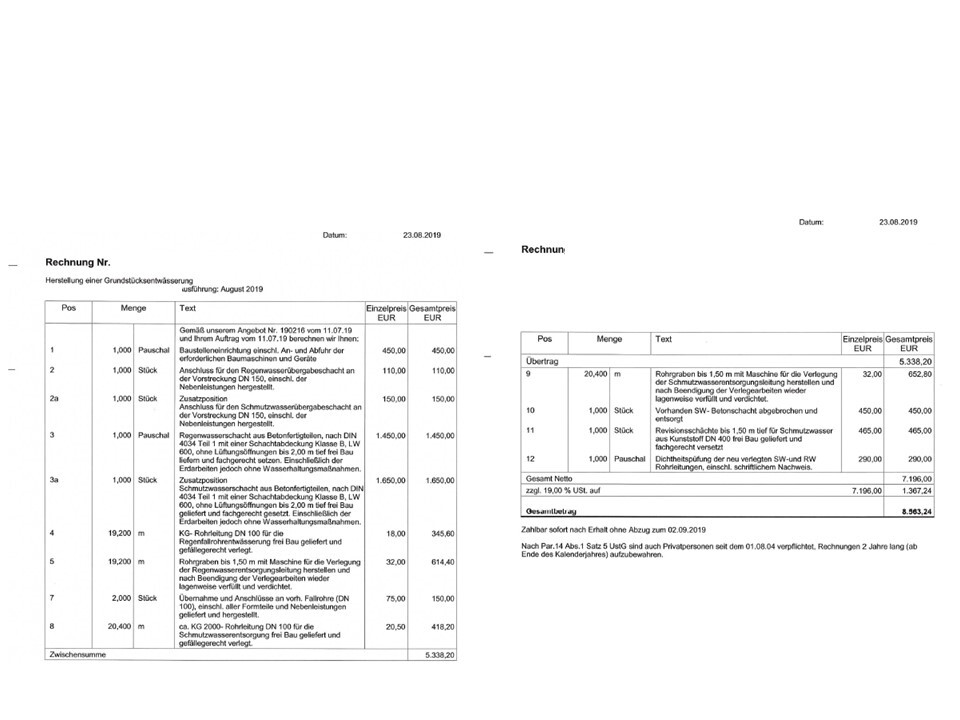 Unsere Entwässerung Rechnung kommt ca 2000€, or 31%, teurer als die akzeptierte Angebot und Auftragbestätigung.