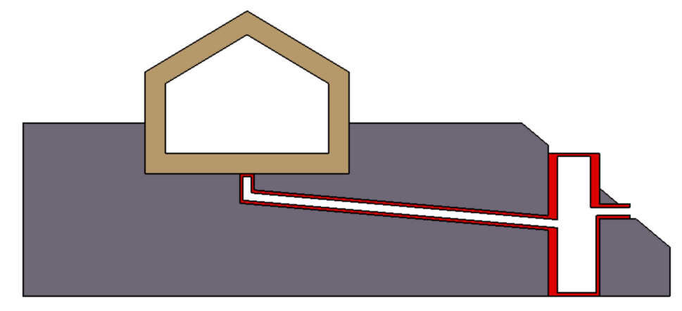 Ein Herabsetzen des Schachtes wäre wegen des Hangs schwierig. Das Haus höher setzen ist keine Option. Im Keller befinden sich das Bad und Wohnräume.